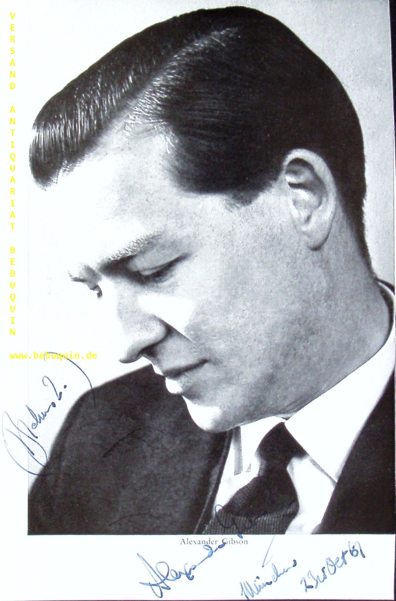 GIBSON, Alexander (Dirigent): eigenhändig signierte und datierte Portraitseite. München (Herkulessaal), 23.10.1967. 21 x 14 cm. 1 Bl. Sir Alexander Drummond Gibson (11 February 1926 – 14 January 1995) was a Scottish conductor and opera intendant. He was also well known for his service to the BBC and his achievements during his reign as the longest serving principal conductor of the Royal Scottish National Orchestra in which the orchestra was awarded its Royal Patronage. (Wikipedia)