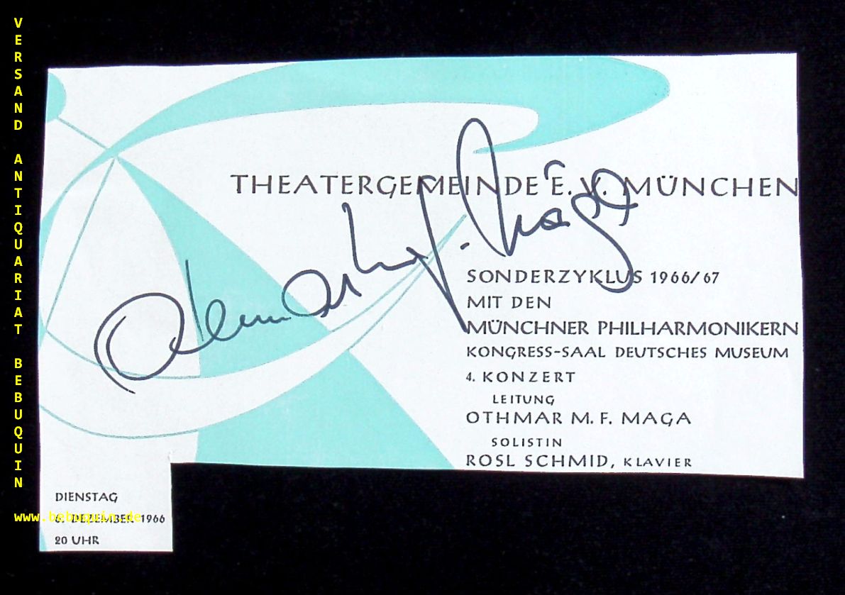MAGA, Othmar (Dirigent): eigenhändig signierte Programmseite der Theatergemeinde. München (Kongresssaal); 6.12.1966. 8 x 13,5 cm. 1 Bl. Othmar Mága (* 30. Juni 1929 in Brünn, Tschechoslowakei; † 28. Januar 2020 in Kiel) war ein deutscher Dirigent. (Wikipedia)