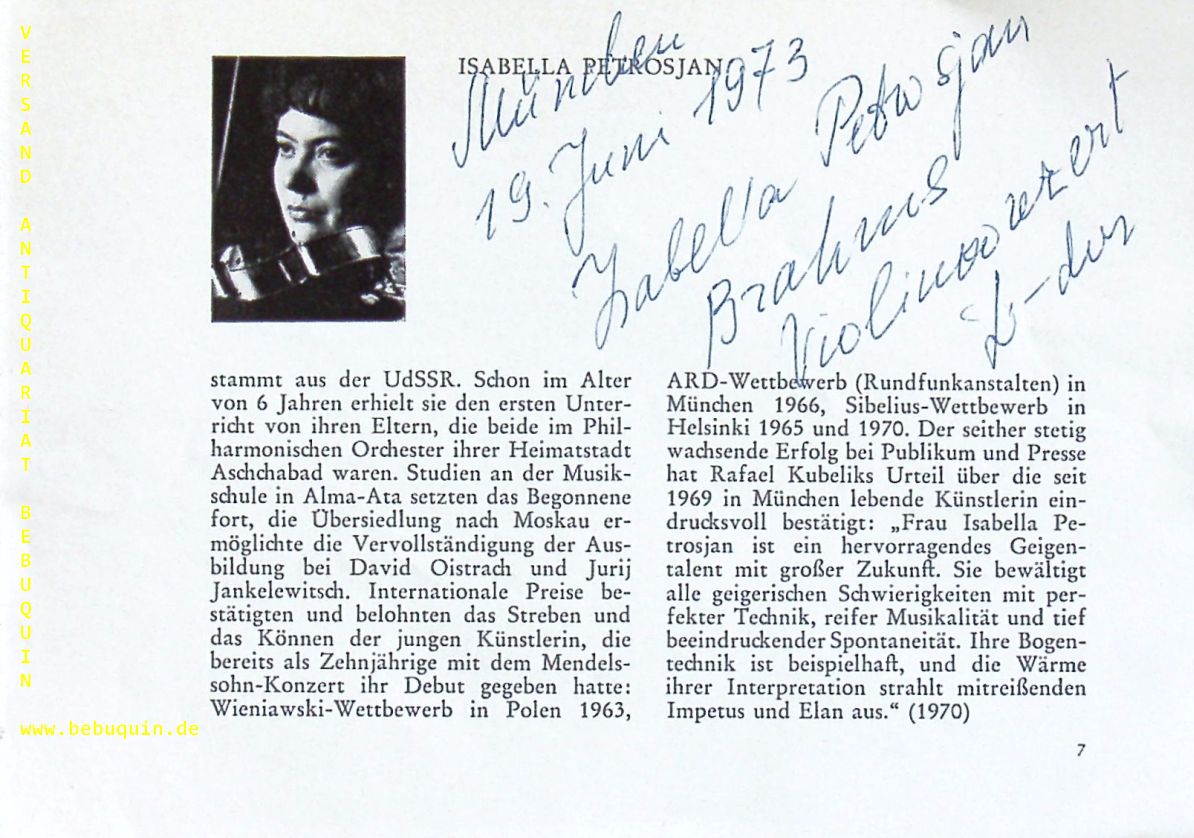 PETROSSIAN, Isabella (Violinistin): eigenhändig signierte und datierte Portraitseite. München, 19.6.1973. 11 x 15,5 cm. 1 Bl. Born to a family of musical traditions, Isabella Petrosian (b. 1939) graduated from Professor David Oistrakh’s class at Moscow Conservatory. Having won a prize in Poznan, she went on to become laureate at other international competitions, including Munich, where she came second, behind Konstanty Andrzej Kulka.