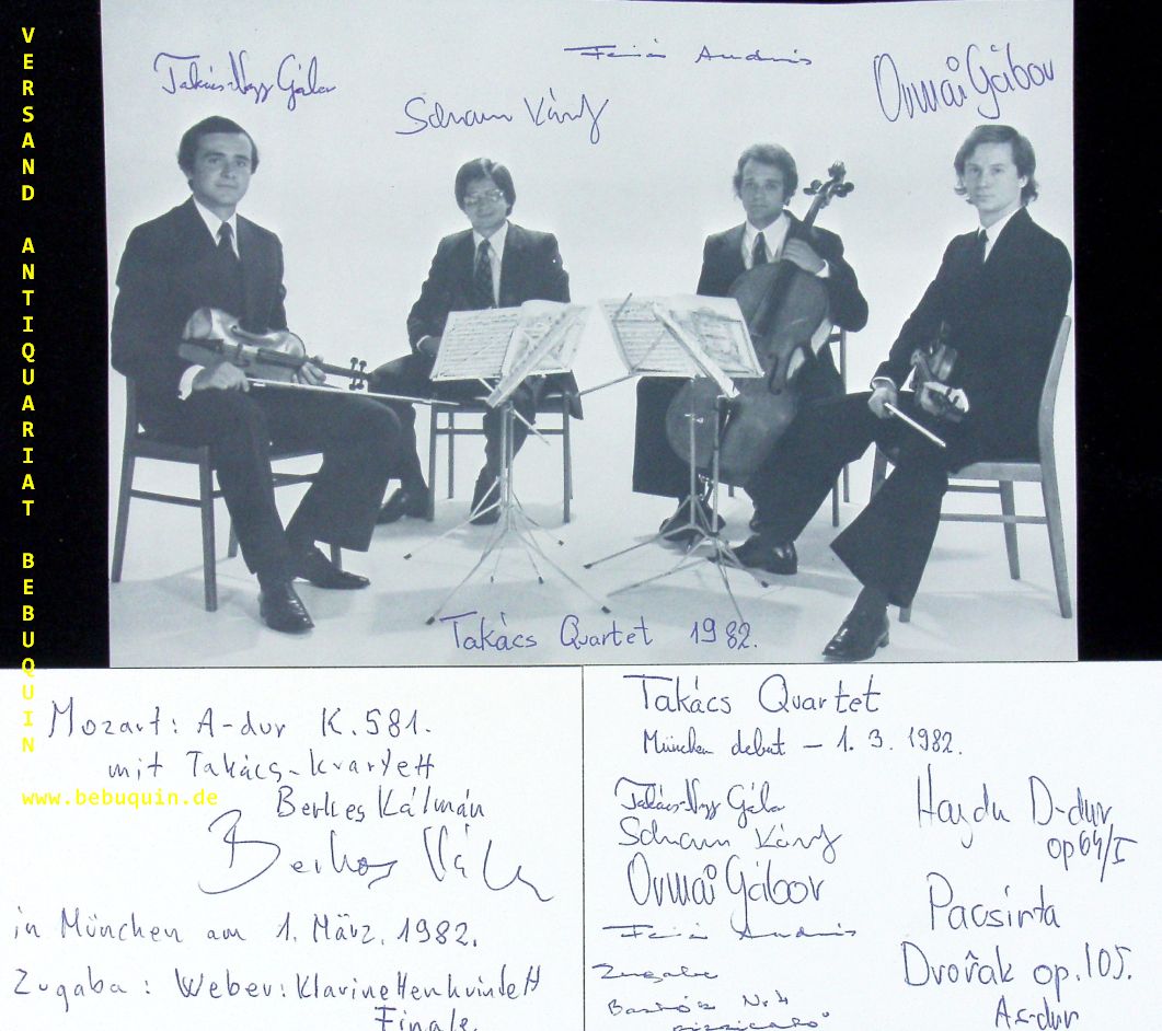 TAKACS QUARTETT.– BERKES, Kalman (Klarinettist) + TAKASC-NAGY, Gabor + SCHRANZ, Karoly + ORMAI, Gabor + FEJER, Andras: eigenhändig von allen vier Künstlern signierte und datierte Autogrammkarte + eine ebenfalls signierte Portraitseite sowie eine vom Gast Kalman Berkes signierte und datierte Autogrammkarte. München (Philharmonie), 1.3.1982. 14,5 x 21 + 8 x 12,5 cm. 2 Karteikarten + 3 Bl. The Takács Quartet is a string quartet, founded in Hungary, and now based in Boulder, Colorado, United States. (Wikipedia)