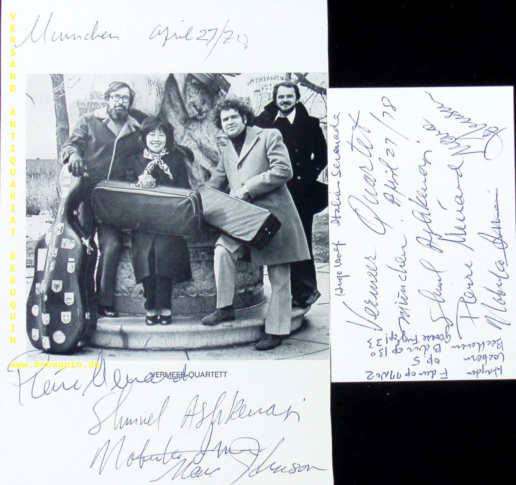 VERMEER-QUARTETT.– ASHKENASI, Shmuel + MENARD, Pierre + IMAI, Nobuko + JOHNSON, Marc: eigenhändig von allen signierte und datierte Autogrammkarte + eigenhändig von allen signierte und datierte Portraitseite. München, 27.4.1978. 21 x 14 + 8 x 12,5 cm. 2 Bl. The Vermeer Quartet was a string quartet founded in 1969 at the Marlboro Music Festival in Vermont and active until 2007. (Wikipedia)