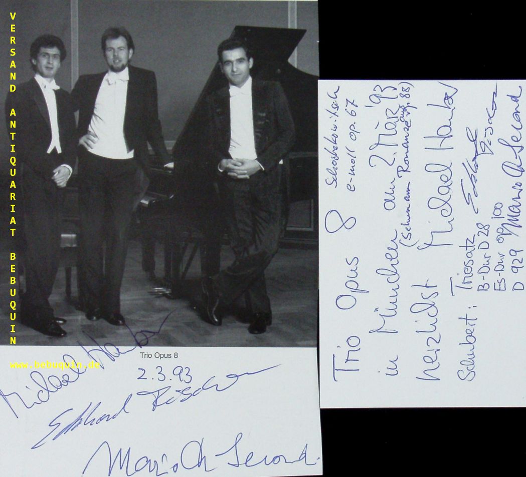 TRIO OPUS 8.– HAUBER, Michael + FISCHER, Eckhard + SECONDI, Mario de: eigenhändig von allen signierte und datierte Autogrammkarte + eigenhändig von allen signierte Portraitseite. München, 2.3.1993. 18,5 x 12,5 cm. 5 Bl. Das Trio Opus 8 wurde 1986 gegründet und war bereits im gleichen Jahr Preisträger bei Kammermusikwettbewerben in Colmar, Triest und Florenz. Seitdem spielt es unverändert in der gleichen Besetzung und feierte im Jahr 2011 sein 25-jähriges Bestehen. (Wikipedia)