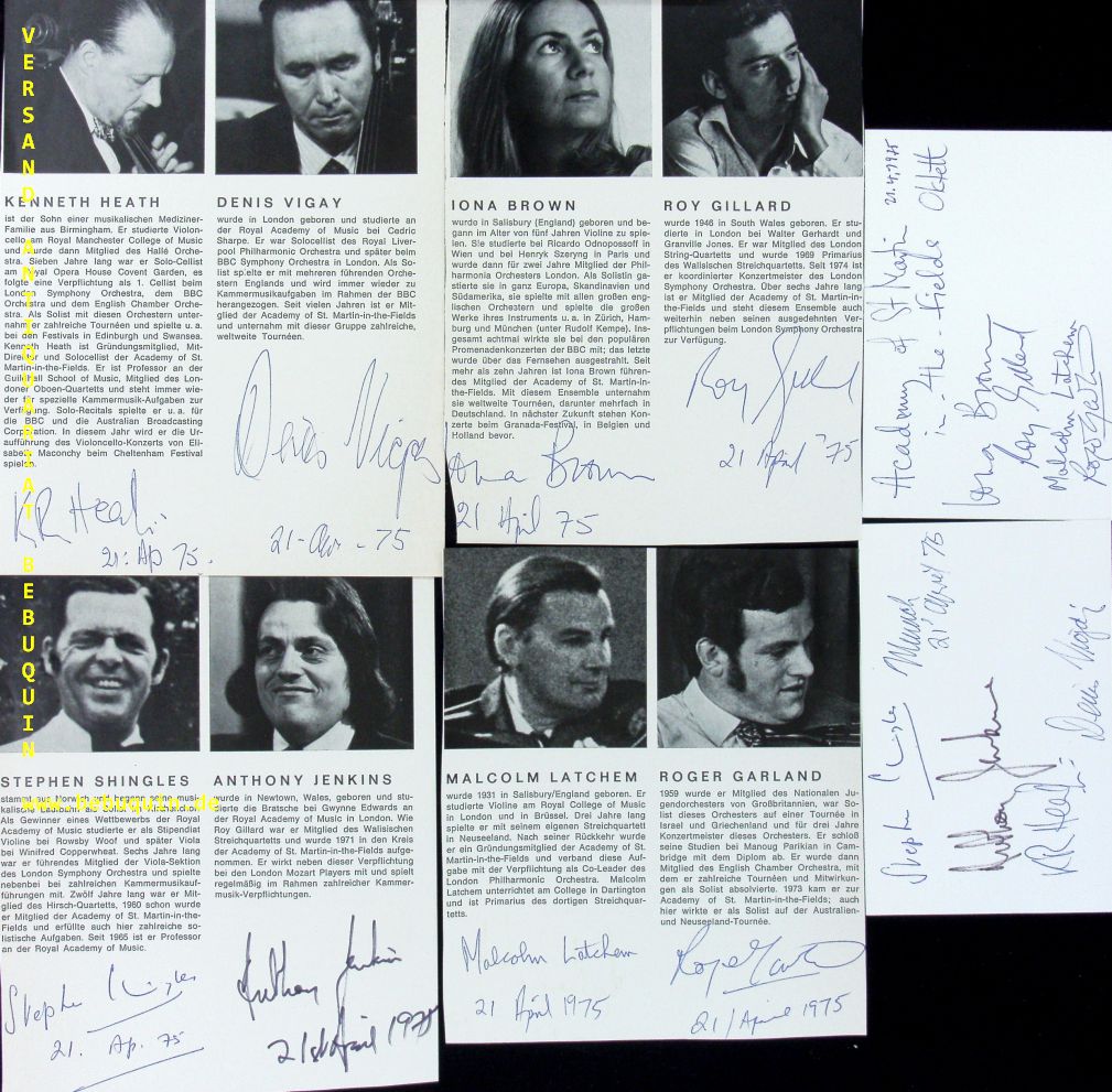 ACADEMY OF ST. MARTIN IN THE FIELDS (OKTETTBESETZUNG).– BROWN + GILLARD + LETCHAN + GARLAND + SHINGLES + JENKINS + HEATH + VIGAY: eigenhändig von allen signierte und datierte Autogrammkarten + ebensolche Portraitseiten. München (Philharmonie), 21.4.1975. 15,5 x 13 + 8 x 12,5 cm. 8 Bl. Die Academy of St Martin in the Fields ist eines der bekanntesten auf Barockmusik und Wiener Klassik spezialisierten Kammerorchester, das auf modernen Instrumenten spielt. Es ist nach der Kirche St Martin-in-the-Fields in London benannt, in der es anfangs auftrat.