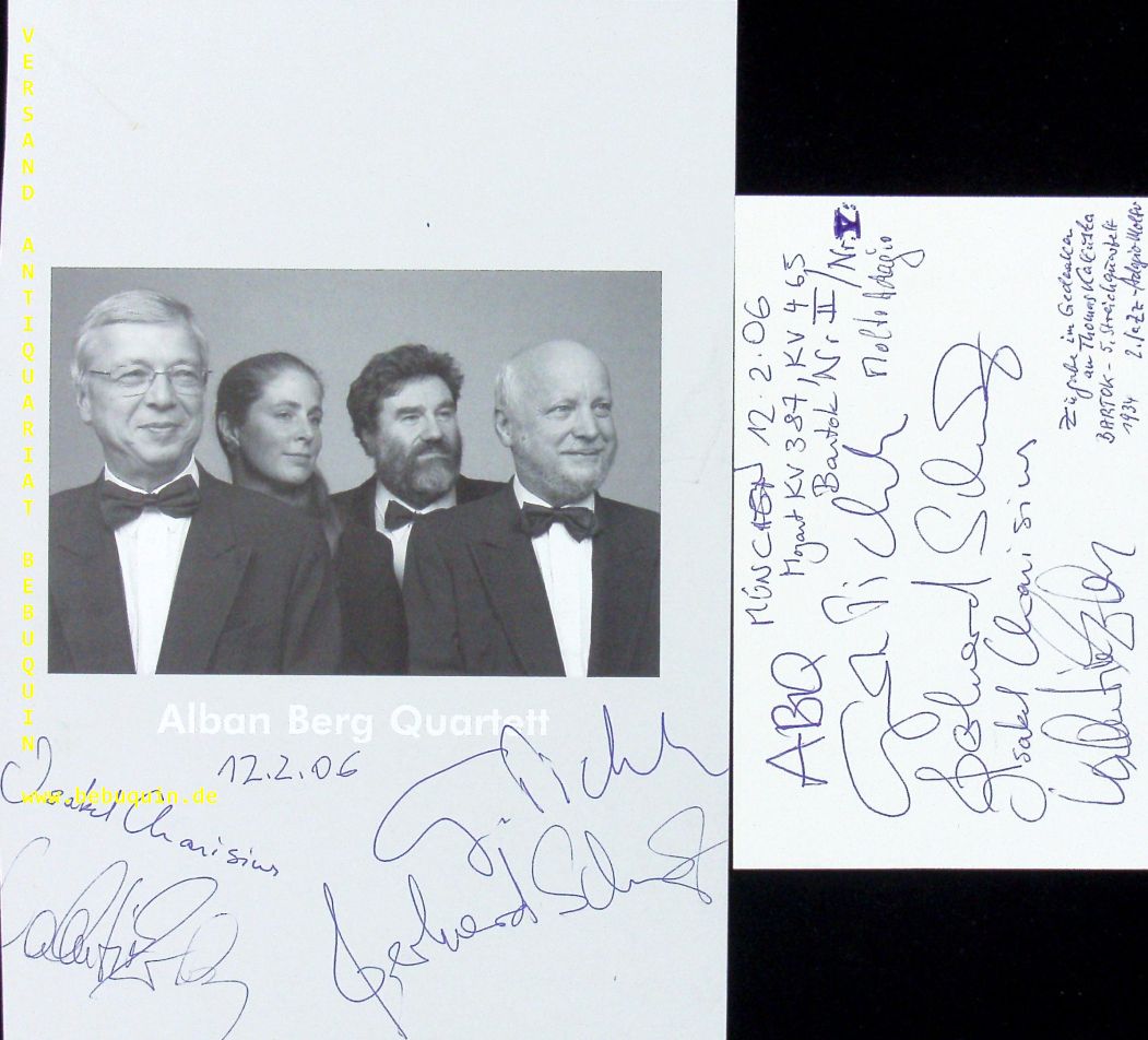 ALBAN BERG QUARTETT.– PICHLER, Günter + SCHULZ, Gerhard + CHARISIUS, Isabel + ERBEN, Valentin: eigenhändig von allen signierte und datierte Autogrammkarte und ebensolche Portraitseite. München (Herkulessaal), 12.2.2006. 21 x 15 cm. 3 Bl. Das Alban Berg Quartett war eines der weltweit führenden Streichquartette. (Wikipedia)