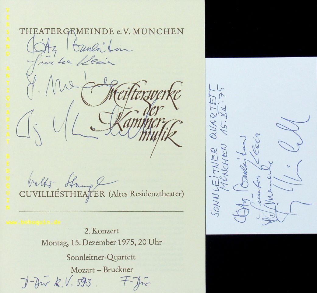 SONNLEITNER QUARTETT.– SONNLEITNER, Florian (Violinist, Dirigent) + MEINECKE, Siegfried (Bratschist) + KLEIN, Günter + KISKALT, Fritz + STANGL, Walter: eigenhändig signierte und datierte Autogrammkarte+ ebensolches Programmheft. München, 15.12.1975. 21 x 15 + 8 x 12,5 cm. 2 Bl. 1980 wurde Florian Sonnleitner Preisträger beim Deutschen Musikwettbewerb in Bonn und 1981 beim Internationalen Musikwettbewerb der ARD in München. Seit 1986 ist er Erster Konzertmeister im Symphonieorchester des Bayerischen Rundfunks.