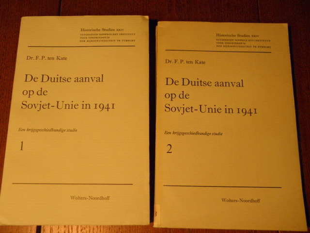 2. WELTKRIEG.– KATE, F. P. ten: De Duitse aanval op de Sovjet-Unie in 1941. Een krijgskundige studie. 2 Bände Groningen (Wolters-Noordhoff), 1968. Gr. 8°. XV, 341, 152 S. + Kartenanhang. OKart. Ordnungsgemäß aus Bundeswehrbeständen ausgesondertes Bibliotheksexemplar (Stempel und Rückenschild). EA. The German invasion of the Soviet Union in 1941. A military-historical study. Volume 1 and 2.