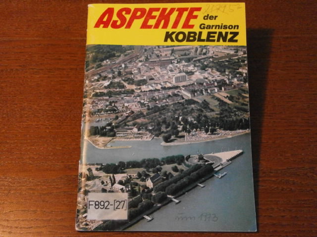KOBLENZ.– SADLOWSKI, Manfred: Aspekte der Garnison Koblenz. Koblenz (Mönch), 1973. 64 S. mit zahlr. Bildern. ill. OKart. Ordnungsgemäß aus Bundeswehrbeständen ausgesondertes Bibliotheksexemplar (Rückenschild und Stempel). EA.