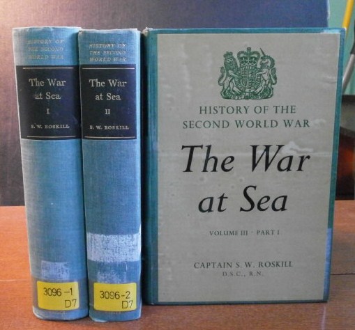 2. WELTKRIEG.– ROSKILL, S.W.: The War at Sea 1939 – 1945. Volume I: The Defensive, 1954; Volume II: The Period of Balance, 1956; VolumeIII/1: The Offensive Part 1: 1 June 1943-31 May 1944, 1960. 3 von 4 Bänden. London (Her Majesty’s Stationery Office), 1954 – 1960. Gr. 8°. XXI, 664 S.; XVI,523 S.;XV,413 S,;XVI,502 S., mit zahlr Tafeln (viele doppelseitig), zahlr. Faltkarten, Skizzen, ganzseitige Karten, kolor. Skizzen, Karten im Text und Terxtabb. teils foiliertes OLn. mit goldgeprägten Rückenschildern. Ordnungsgemäß aus Bundeswehrbeständen ausgesondertes Bibliotheksexemplar (Stempel, Rückenschild). = History of the Second World War. United Kingdom Military Series.