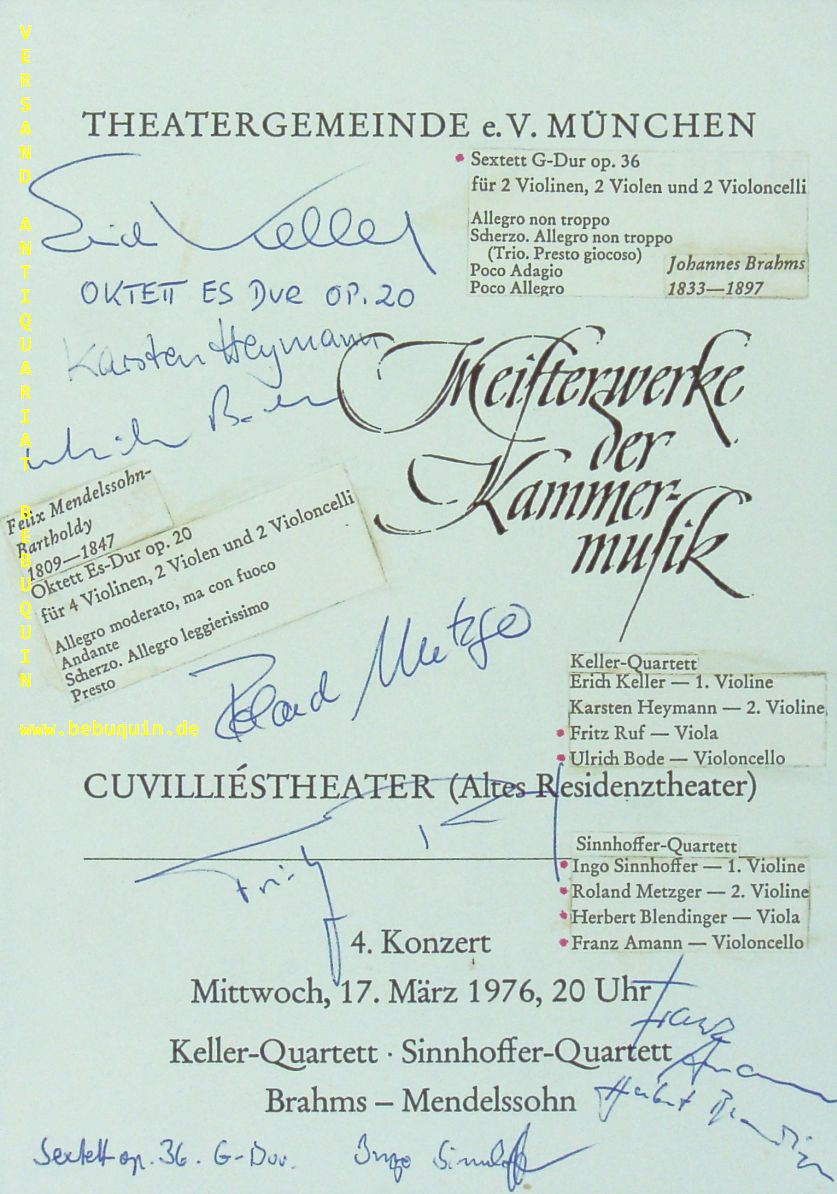 SINNHOFFER & KELLER QUARTETT.– SINNHOFFER, Ingo + GROBHOLZ, Werner + BLENDINGER, Herbert + AMANN, Franz + KELLER, Erich + HEYMANN, Karsten + RUF, Fritz + BODE, Ulrich: eigenhändig von allen signierte und datierte Programmseite. München (Residenztheater) 17.3.1976. 21 x 15 cm. 1 Bl.