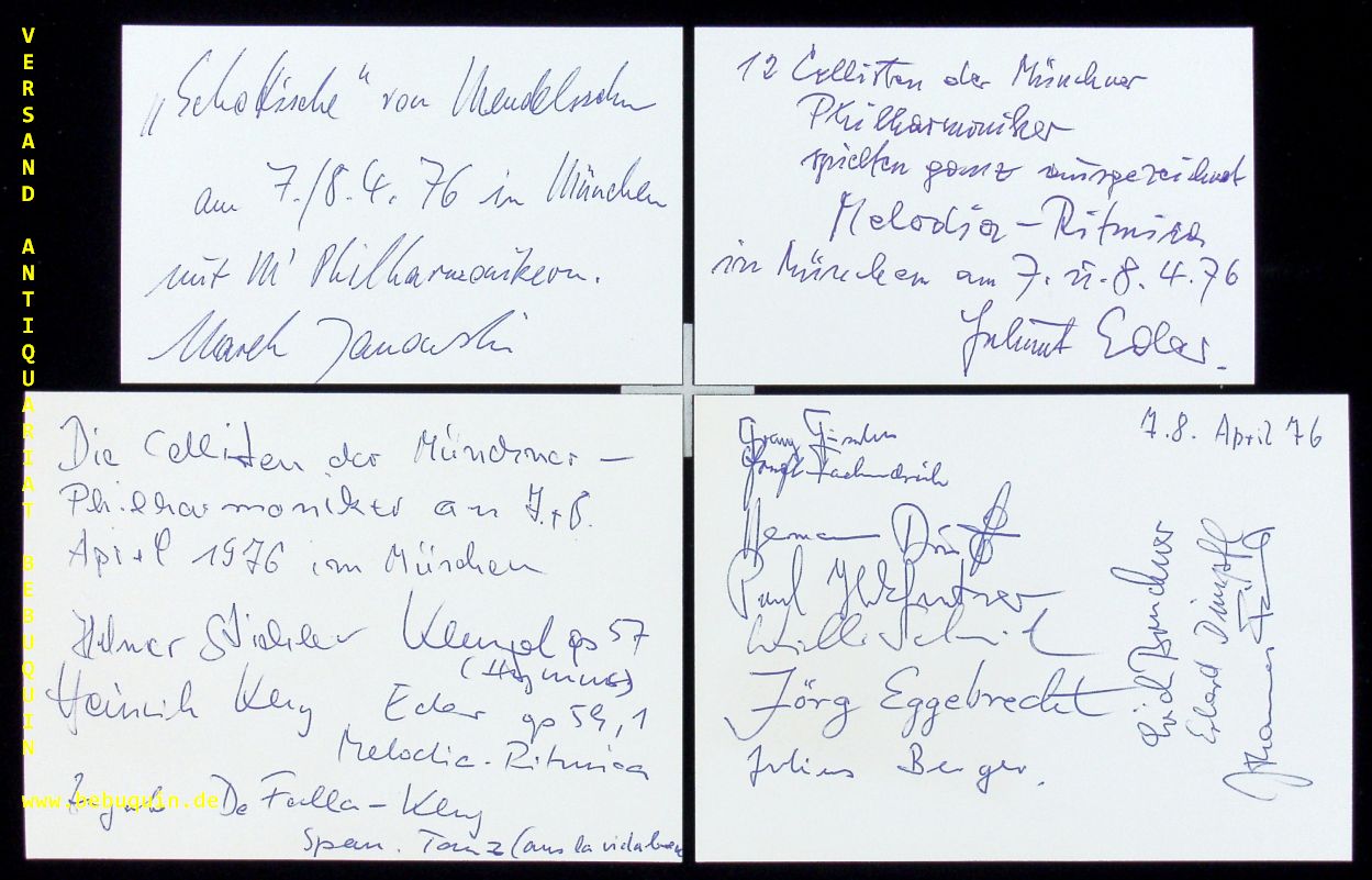JANOWSKI, Marek (Dirigent) + 11 CELLISTEN: 4 eigenhändig signierte und teils datierte Autogrammkarten. München, 7./8.4.1976. 8 x 12,5 + 10,5 x 14,5 cm. 4 Karteikarten. Marek Janowski (* 18. Februar 1939 in Warschau) ist ein deutscher Dirigent. Dabei die Cellisten der Münchner Philharmoniker. (Wikipedia)