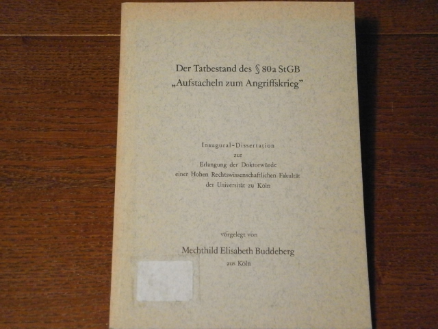 RECHTSWESEN.– BUDDEBERG, Mechthild Elisabeth: Der Tatbestand des § 80a StGB „Aufstacheln zum Angriffskrieg“. Inaugural-Dissertation. Köln, 1976. 121 S. Okart. Ordnungsgemäß aus Bundeswehrbeständen ausgesondertes Bibliotheksexemplar (Rückenschild und Stempel).