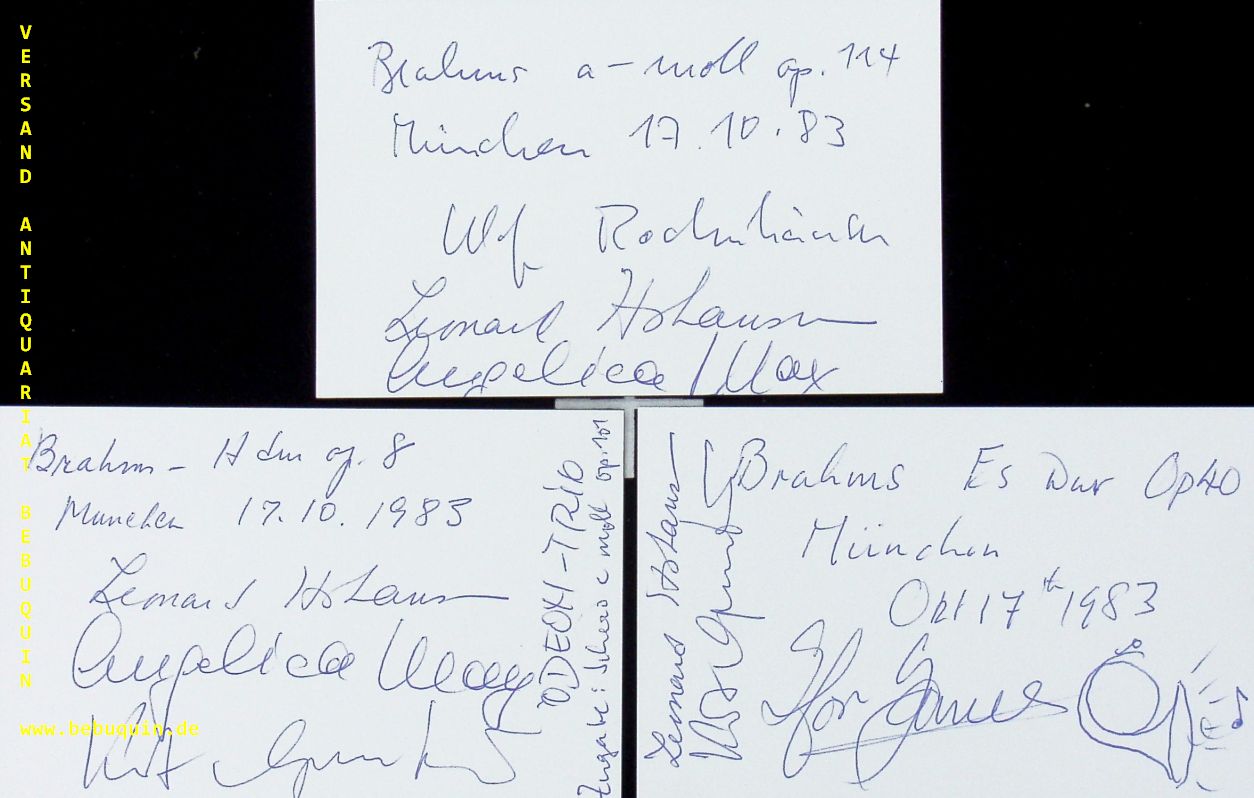 ODEON TRIO.– JAMES, Ifor (Hornist) + RODENHÄUSER, Ulf (Klarinettist) + MAY, Angelica (Cellistin) + GUNTNER, Kurt (Violinist) + HOKANSON, Leonard (Pianist): 3 eigenhändig von allen signierte und datierte Autogrammkarten. München (Herkulessaal), 17.10.1983. 8 x 12,5 cm. 7 Bl. Autogramme von Angelica May (17.9.1933 – 7.1.2018) sind von großer Seltenheit. Angelica May war eine der renommiertesten deutschen Cellistinnen der Nachkriegszeit. Sie hatte das Glück, noch beim großen Pablo Casals studieren zu können. Angelica May gehörte zu den wenigen deutschen Cellistinnen, die sich nach dem Zweiten Weltkrieg einen internationalen Ruf erspielen konnten.