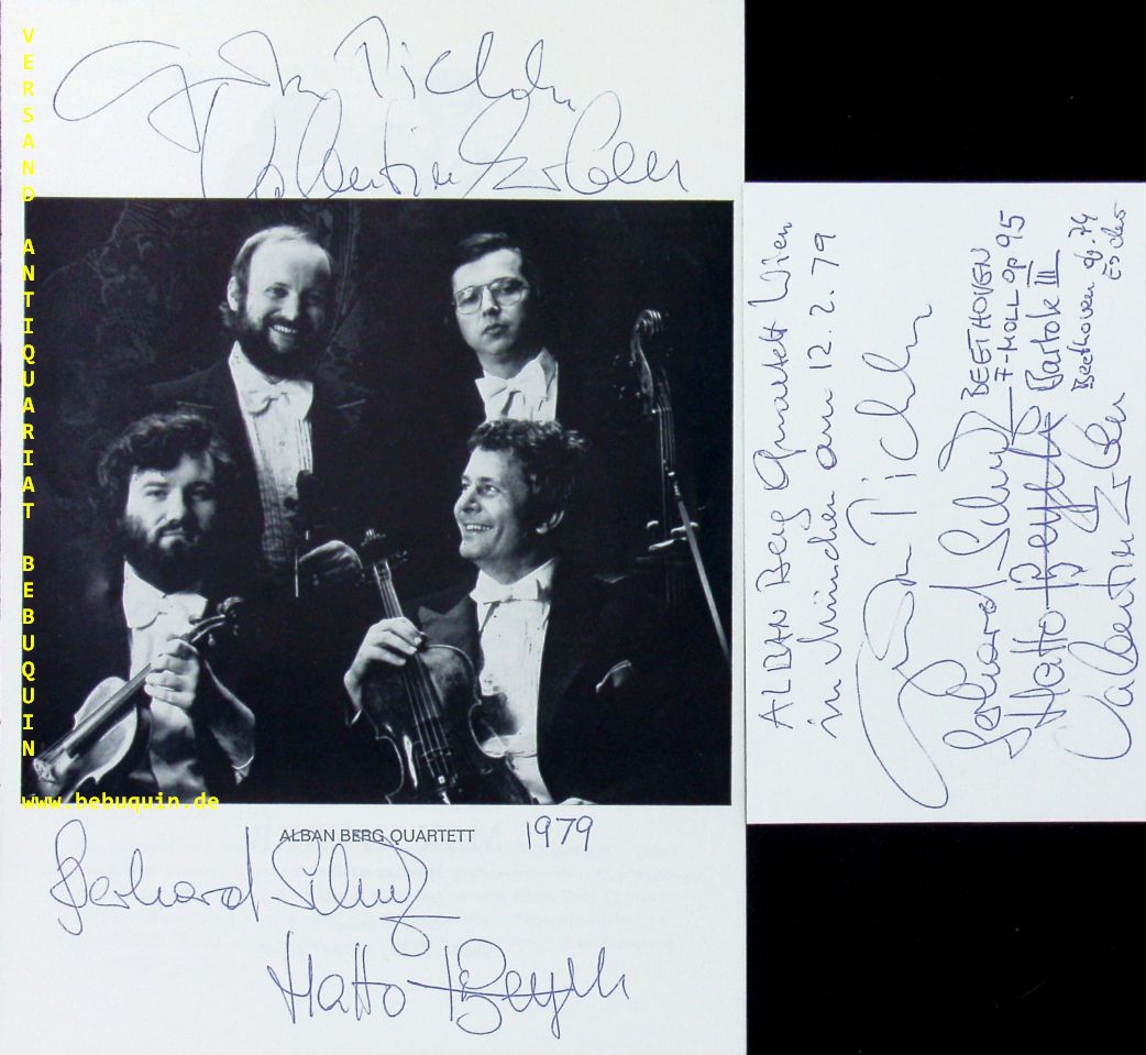 ALBAN BERG QUARTETT.– PICHLER, Günter + SCHULZ, Gerhard + BEYERLE, Hatto + ERBEN, Valentin: eigenhändig von allen signierte und datierte Autogrammkarte und ebensolche Portraitseite. München (Herkulessaal), 12.2.1979. 21 x 15 cm. 4 Bl. Das Alban Berg Quartett war eines der weltweit führenden Streichquartette. (Wikipedia)
