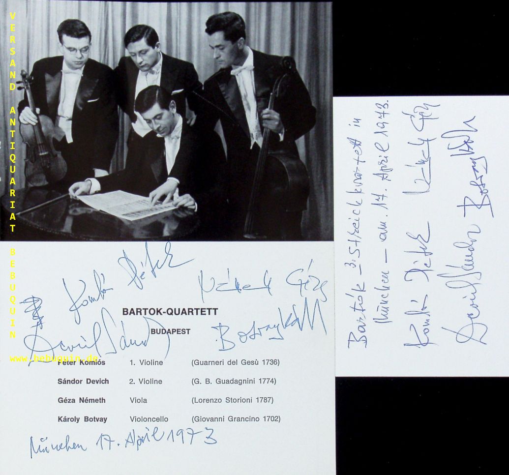 BARTOK QUARTETT.– KOMLOS, Peter + DEVICH, Sandor+ NEMETH, Geza + BOLVAY, Karoly: eigenhändig signierte und datierte Autogrammkarte + ebensolche Portraitseite. München (Herkulessaal), 17.4.1973. 21 x 15 cm. 3 Bl. Das Bartók Quartett ist ein ungarisches Streichquartett, gegründet 1963 in Budapest als Nachfolge-Ensemble des Komlós Quartetts (1957–63). Das Repertoire umfasst besonders Werke der Wiener Klassik und Béla Bartóks sowie zeitgenössischer ungarischer Komponisten. (Wikipedia)