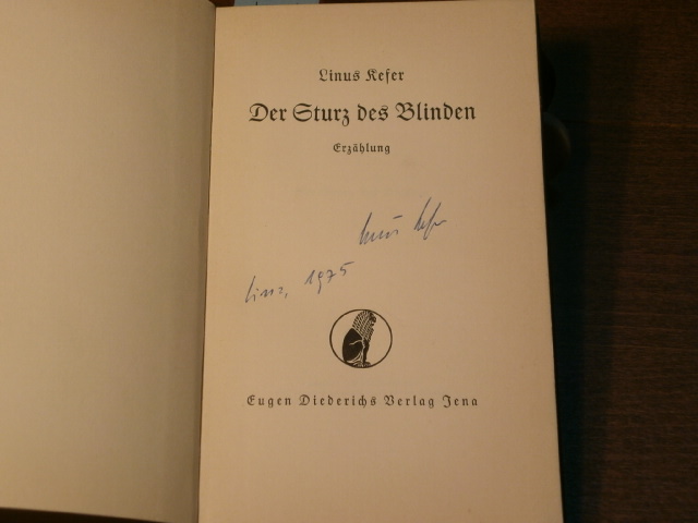 KEFER, Linus: Der Sturz des Blinden. Erzählung. Jena (Diederichs), 1938. 153 (2) S. OLn. EA mit der datierten eigenhändigen Signatur des Verfassers auf Titelseite.