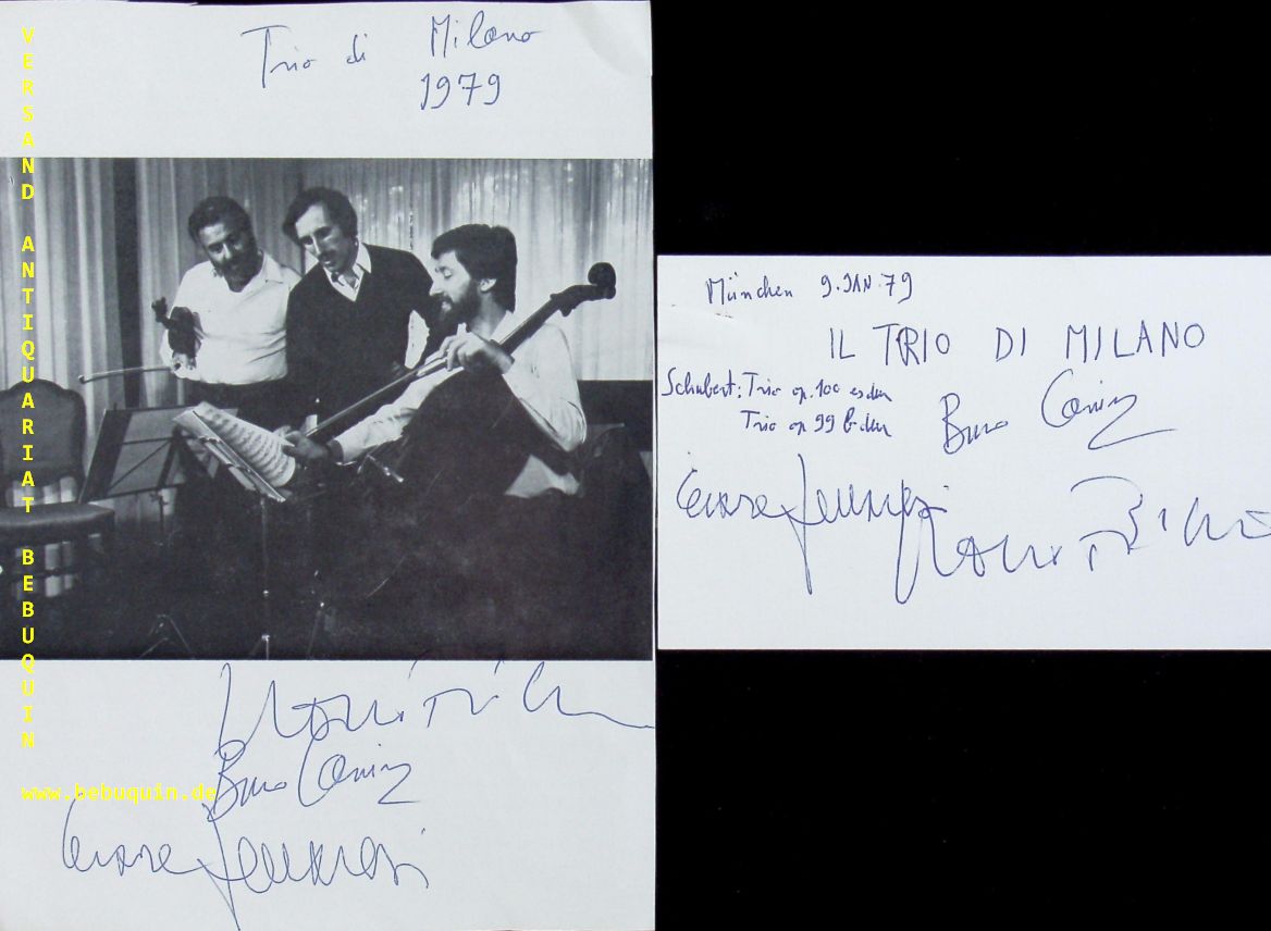 TRIO DI MILANO.– FERRARESI, Cesare (Violinist) + FILIPPINI, Rocco (Cellist) + CANINO, Bruno (Pianist): eigenhändig von allen signierte Autogrammkarte + ebensolche Portraitseite. München (Herkulessaal), 9.1.1979. 19 x 13,5 cm. 2 Bl. Das Trio di Milano wurde 1968 von Bruno Canino, Rocco Filippini und dem 1981 früh verstorbenen Geiger Cesare Ferraresi gegründet. An seine Stelle trat 1985 die aus Rumänien stammende Mariana Sirbu. (Wikipedia)