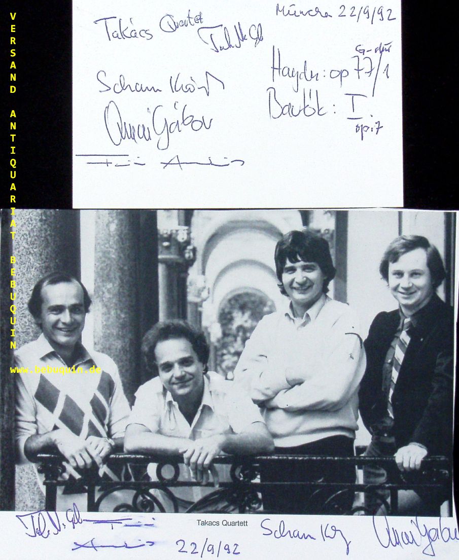 TAKACS QUARTETT.– TAKASC-NAGY, Gabor + SCHRANZ, Karoly + ORMAI, Gabor + FEJER, Andras: eigenhändig von allen vier Künstlern signierte und datierte Autogrammkarte sowie eine ebenfalls von allen signierte Portraitseite. München (Philharmonie), 22.9.1992. 15 x 13 + 8 x 12,5 cm. 4 Bl. leicht verwischt. The Takács Quartet is a string quartet, founded in Hungary, and now based in Boulder, Colorado, United States. (Wikipedia)
