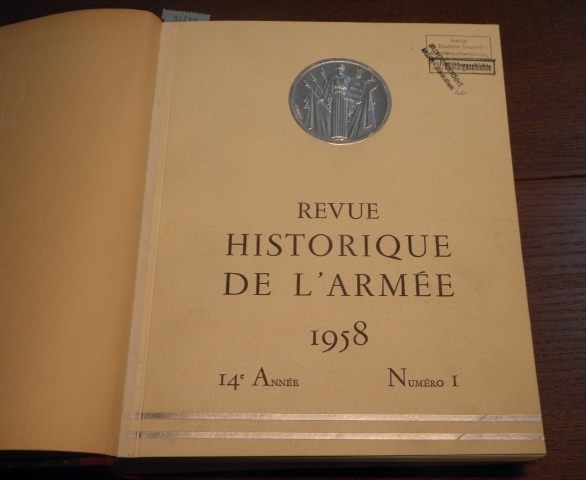 REVUE HISTORIQUE DE L’ARMEE.– 1958. Couronnée par l’Academie Francaise en 1954. Redaktion Colonel P. Lyet. 14. Jahrgang. 4 Hefte des kompletten Jahrgangs in 1 Band. Paris (Ministère de la Guerre), 1958. 4°. ca 800 S. mit sehr vielen teils farbigen Bildern im Text und auf Tafeln. OHLn mit goldgeprägtem Rücken. Ordnungsgemäß aus Bundeswehrbeständen ausgesondertes Bibliotheksexemplar (Stempel, Rückenschild). Die mit eingebundenen Originalumschläge ziert jeweils ein blindgeprägtes Medaillon (dieses fehlt beim 3. Heft).