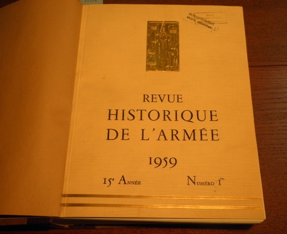 REVUE HISTORIQUE DE L’ARMEE.– 1959. Couronnée par l’Academie Francaise en 1954. Redaktion Colonel P. Lyet. 15. Jahrgang. 4 Hefte des kompletten Jahrgangs in 1 Band. Paris (Ministère de la Guerre), 1959. 4°. ca 800 S. mit sehr vielen teils farbigen Bildern im Text und auf Tafeln. OHLn mit goldgeprägtem Rücken. Ordnungsgemäß aus Bundeswehrbeständen ausgesondertes Bibliotheksexemplar (Stempel, Rückenschild). Die mit eingebundenen Originalumschläge ziert jeweils ein blindgeprägtes Medaillon.
