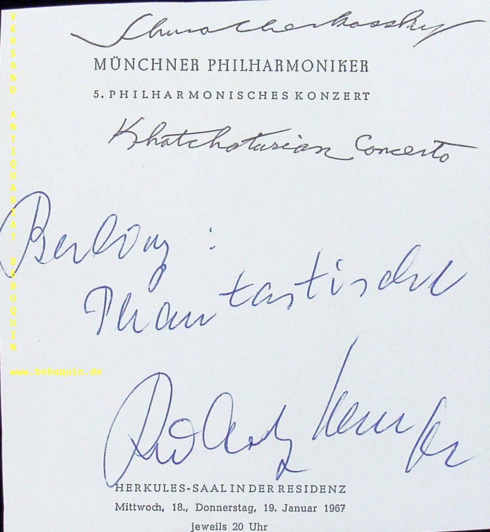 CHERKASSKY, Shura (Pianist): eigenhändig signiertes Programm. Dabei weitere Unterschrift von Rudolf Kempe und Privatphoto beim Sgnieren. München (Herkulessaal), 19.1.1967. 14, 5 x 13, 5 cm. 3 Bl. Shura Cherkassky (* 7. Oktober 1909 in Odessa; † 29. Dezember 1995 in London) war ein jüdischer Pianist aus Südrussland. Er kam als Kind in die USA und verbrachte die letzten 34 Jahre seines Lebens in London. (Wikipedia)