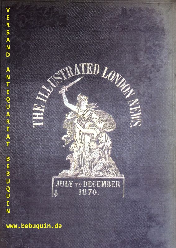 THE ILLUSTRATED LONDON NEWS.– Vol. LVII. Hrsg. von John Lash. Juli bis Dezember 1870. London (Leighton), 1870. 41 x 30 cm. IV, 692 S. mit Hunderten von Holzschnittillustrationen aller Größen und Inhalte sowie 1 gefaltete Farbtafel . ill. OLn mit Gold- und Blindprägung. Rücken geblichen und am oberen Kap. stärker lädiert, innen nur vereinzelt fleckig, die Farbtafel lädiert, sonst gut erhalten. Eine Auswahl der Motive: Railway Accident rear Newark, Meeting of the Agricultural Society at Oxford, All-England Croquet Club at Wimbledon, A Sketch at Birmingham Cattle-Show, Scenes in China: I-Chang Gorge on the Upper Yang-Tze-Kiang, Christmas in Australia, Prize Dogs at the Birmingham Show, Prize Dogs at the Crystal Palace, Paris Fashion for July, India: The Oghee Punjaub Frontier Post, Spinning Net Thread in the Claddagh Ireland, Appearance of the Plantet Jupiter, Scenes in Paris: Arrest of a Supposed Prussian Spy on the Boulevard de Italians Paris, The Halles Centrales, Balloon from Paris Passing over Versailles, Battle of Sedan, French Prisoners on the Road from Sedan, Guns Captured by Prussians at Sedan, Map of the Country Around Chalons, The Siege of Metz: Imperial Guard, Prussian Advance Post at Mercy Le Haunt, View of the South West, The Fight at Mouzon, The Sedge and Defence of Paris: Burning Houses to Clear Space to before Fort Bicetre, A Captive Balloon at Montmatre, Departures of Americans and English, Gun-Boats on the Seine, Troops of the Regular Army encamped in the Champs Elysees, Battle at Villejuif, Prussian Spies Brought into Paris, French Guns and Fortifications, Waiting at Le Mans for a Train to Tours. Sehr interessanter Jahrgang zum Deutsch/Französischen Krieg 1870/71.