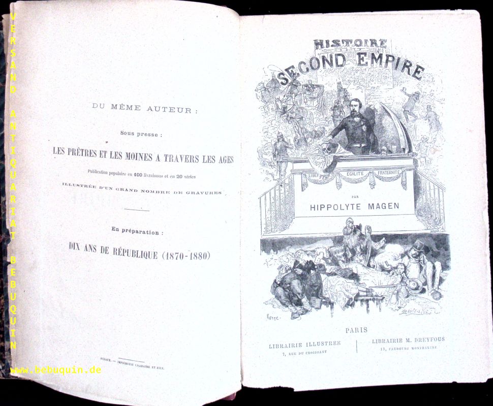 FRANKREICH.– MAGEN, Hippolyte: Histoire du Second Empire (1848-1870). Paris (Maurice Dreyfous), 1878. 4°. 800 S. mit zahlr. Holzschnittabb. HLdr der Zeit mit goldgeprägtem Rücken. Titelei etwas randlädiert, sonst gut erhalten. = Bibliothèque moderne. EA.