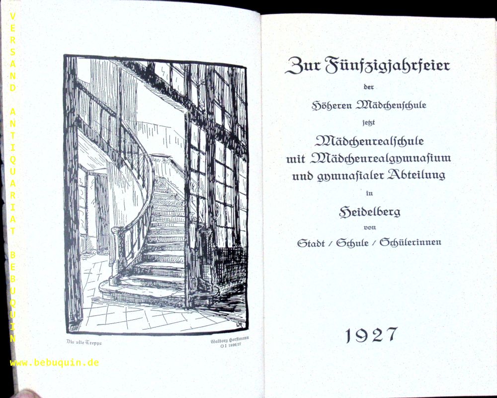 HEIDELBERG.– EHRMANN, Eugen: (Vorwort) Zur Fünfzigjahrfeier. der Höheren Mädchenschule jetzt Mädchenrealschule mit Mädchenrealgymnasium und gymnasialer Abteilung in Heidelberg von Stadt, Schule, Schülerinnen. Heidelberg, 1927. XI, 356 S. mit zahlr. Bildtafeln. OKart mit Goldprägung. Einband mit Lichtrand. EA.