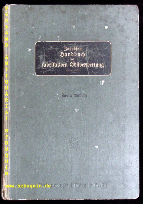 LANDWIRTSCHAFT.– JACOBSEN, Eduard: Handbuch der fabrikativen Obstverwertung auf praktisch-wissenschaftlicher Grundlage. 2., umgearb. Aufl. Berlin (Parey), 1919. Gr. 8°. XX, 706 S. mit 118 in den Text gedr. Abb. OHLn. Einband angeschmuttz, Rücken gebräunt und an den Ecken bestoßen, sonst ordentlich.