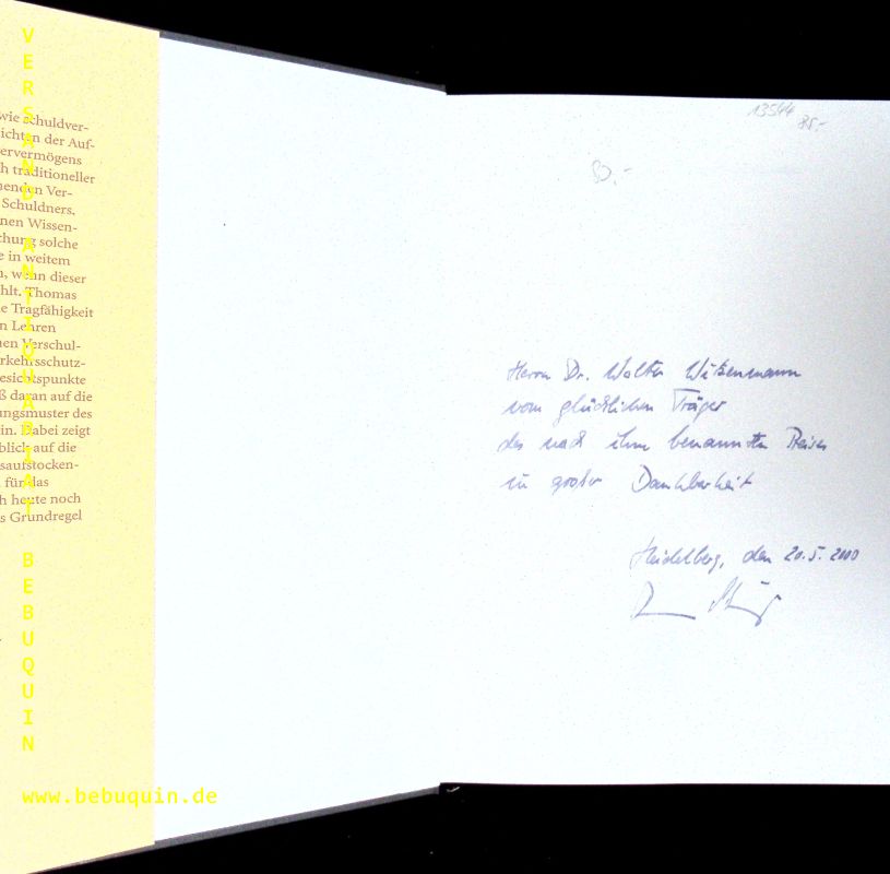 RECHTSWESEN.– LOBINGER, Thomas: Rechtsgeschäftliche Verpflichtung und autonome Bindung. Zu den Entstehungsgründen vermögensaufstockender Leistungspflichten im Bürgerlichen Recht. Tübingen (Mohr Siebeck), 1999. Gr. 8°. XVI, 371 S. OLn mit OUmschl. = Tübinger rechtswissenschaftliche Abhandlungen, Bd. 88. EA mit einer eigenhändigen 6zeiligen persönlichen datierten und signierten Verfasserwidmung an Walter Witzenmann