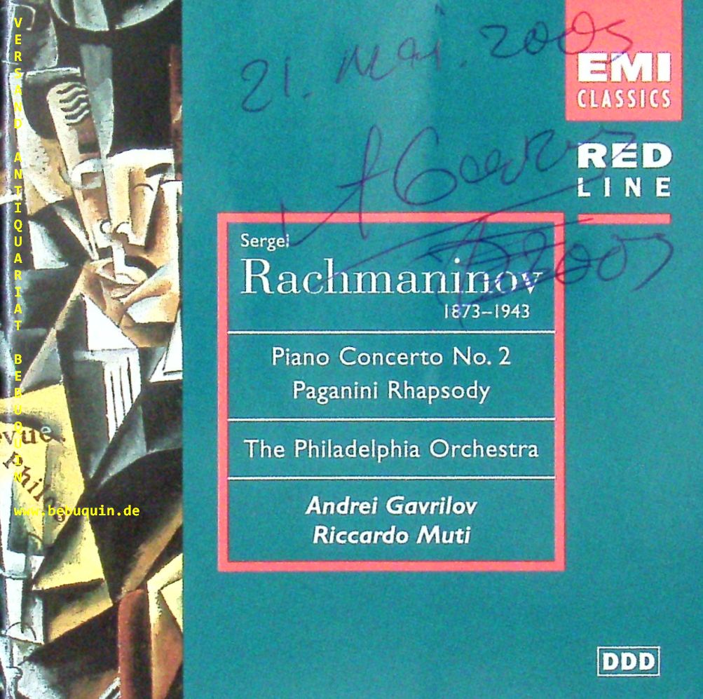 KLASSIK-CD.– GAVRILOV, Andrei (Pianist): eigenhändig auf dem Booklet datiert und signiert. Rachmaninov: Piano Concerto No 2. Philadelphia Orchestra mit Riccardo Muti. EMI (724356986923), 21.5.2003. Original CD. Andrei Wladimirowitsch Gawrilow (* 21. September 1955 in Moskau) ist ein russischer Pianist. Nach dem Gewinn des Tschaikowski-Wettbewerbs 1974 wurde Gawrilows internationale Karriere zweimal abrupt unterbrochen: 1979 bis 1984 wurde er vom Sowjet-Regime in die Isolation gezwungen, 1993 bis 2001 zog er sich aufgrund einer Lebenskrise vollkommen zurück. Seit 2001 lebt Gawrilow in der Schweiz und setzt dort seine Karriere fort.