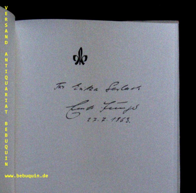 JÜNGER, Ernst: Gläserne Bienen. 11.– 14. Tsd. Stuttgart (Klett), (1963). 172 S. OLn. mit OUmschl. tadellos. Des Courdes B 36c mit einer eigenhändigen voll signierten und datierten Widmung an Erika Gerlach auf Vortitel.