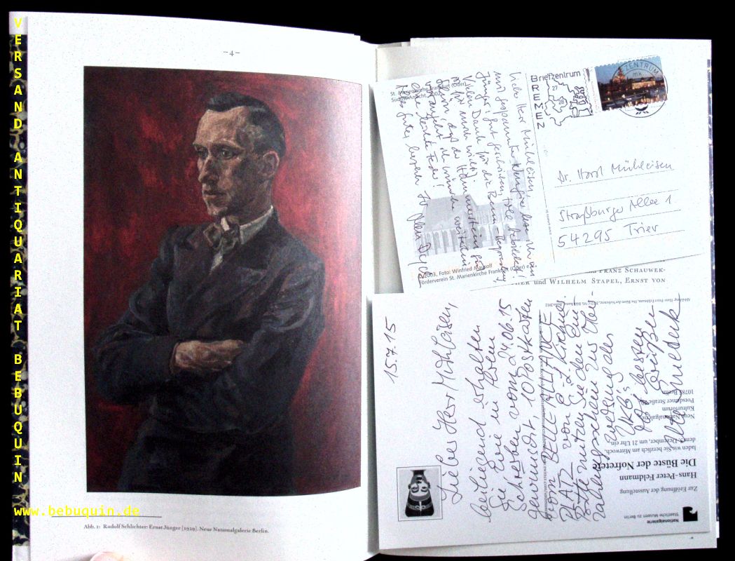 JÜNGER.– MÜHLEISEN, Horst: Ernst Jünger in Berlin 1927 – 1933. 2., vom Verf. durchges. u. verb. Aufl. Frankfurt (Oder), (Kleist-Museum), 2008. 4°. 16 S. mit zahlr. Abb. ill. OBr. wie neu. = Frankfurter Buntbücher, 20. Mit zwei Postkarten Ernst Jünger betreffend an den Verfasser inliegend.
