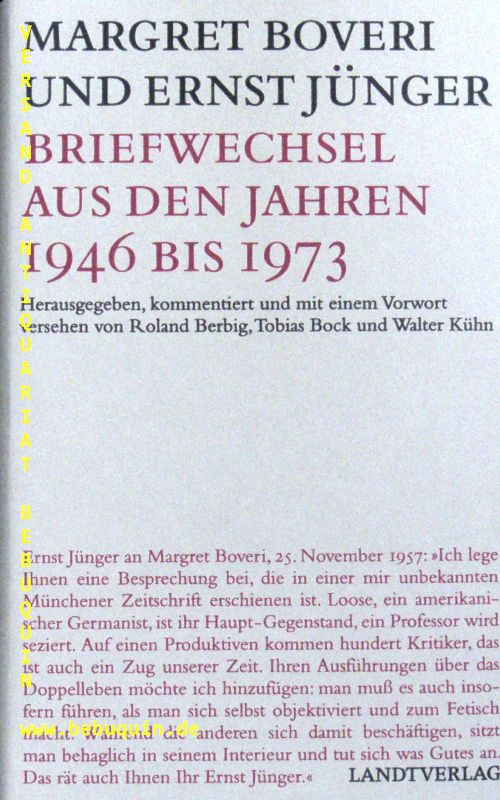 JÜNGER, Ernst / BOVERI, Margret: Briefwechsel aus den Jahren 1946 bis 1973. Hrsg. von Berbig, Bock und Kühn . Berlin (Landt), 2008. 333 S. mit Titelbild. OPb mit OUmschl. tadellos. EA.