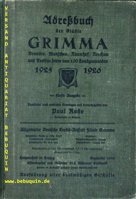 GRIMMA.– RODE, P.: (Hrsg.) Adressbuch der Städte Grimma 1925/26.– sowie Brandis, Mutzschen, Naunhof, Nerchau und Trebsen sowie Nachbar-Landgemeinden. Bearbeitet nach amtlichen Unterlagen. 5. Ausgabe. Grimma (Bode), 1925/26. XL S., 3 nn. Bl., 160 S., 7 nn. Bl., 124, 61 S., 1 nn. Bl., 68, 94, 48, 8 S. ill. OHLn. Kanten leicht berieben, gutes Ex. seltenes Axdressbuch.