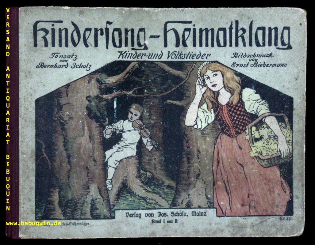 SCHOLZ KÜNSTLER-BILDERBÜCHER.– SCHOLZ, Bernhard: Kindersang – Heimatklang. Deutsche Kinderlieder. Bd. I + II in 1 Bd. Mainz (Jos. Scholz), ca 1900. Quer 4°. 16, 16 S. mit zahlr. farblithographischen Bildern und Bildtafeln von Ernst Liebermann. farb. ill. OHLn. Ecken berieben, Einband gebräunt, innen an den Rändern etwas fingerspurig, Rückdeckel mit Kritzelei, sonst aber innen schön mit farbstarken Drucken. = Das deutsche Bilderbuch.
