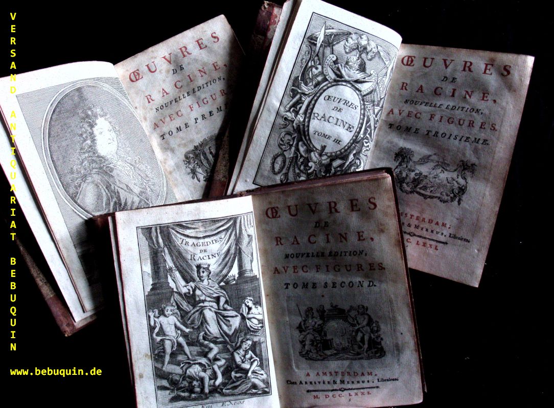 RACINE, Jean: Oeuvres. Avec Figures. Nouvelle Edition. 3 Bände. Amsterdam (Arkstee & Merkus), 1771. 12°. XLII S., 5 Bl., 376 S. 11 Bl., 340 S., 10 Bl., 366 S. mit einigen Kupfertafeln. HLdr der Zeit mit goldgeprägten Rückenschildern, marmorierten Vorsätzen und dreiseitigem Rotschnitt. Kanten etwas berieben, insgesamt gut.