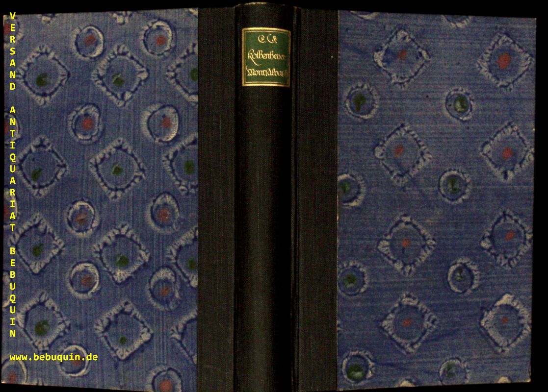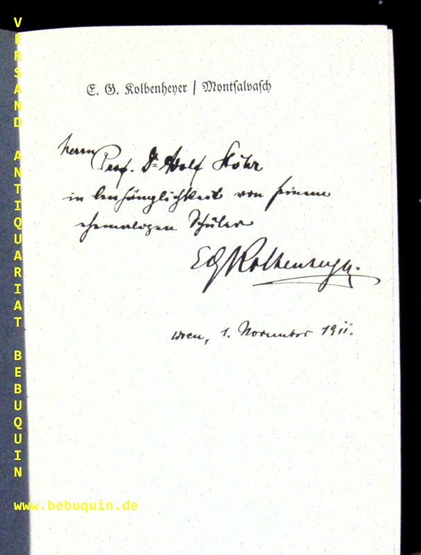 KOLBENHEYER, E.G.: Montsalvasch. Ein Roman für Individualisten. München (Georg Müller), 1912. 344 (2) S OHLn mit goldgeprägtem Rückenschild. Ex libris von Prof. Adolf Stöhr auf Innendeckel etwas beschädigt. EA WG² 5. Mit einer 5zeiligen eigenhändigen voll signierten und datierten Verfasserwidmung an Prof. Adolf Stöhr auf Vortitel: „Herrn Prof. Dr. Adolf Stöhr in Anhänglichkeit von seinem ehemaligen Schüler. Adolf Stöhr (* 24. Februar 1855 in St. Pölten, Kaisertum Österreich; † 10. Februar 1921 in Wien), bei dem Kolbenheyer in Wien studiert hatte, war ein österreichischer Philosoph und Psychologe. (Wikipedia)