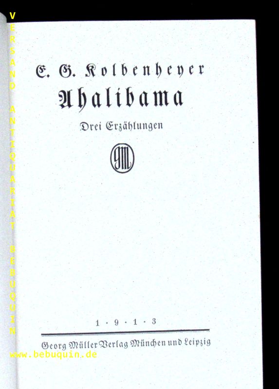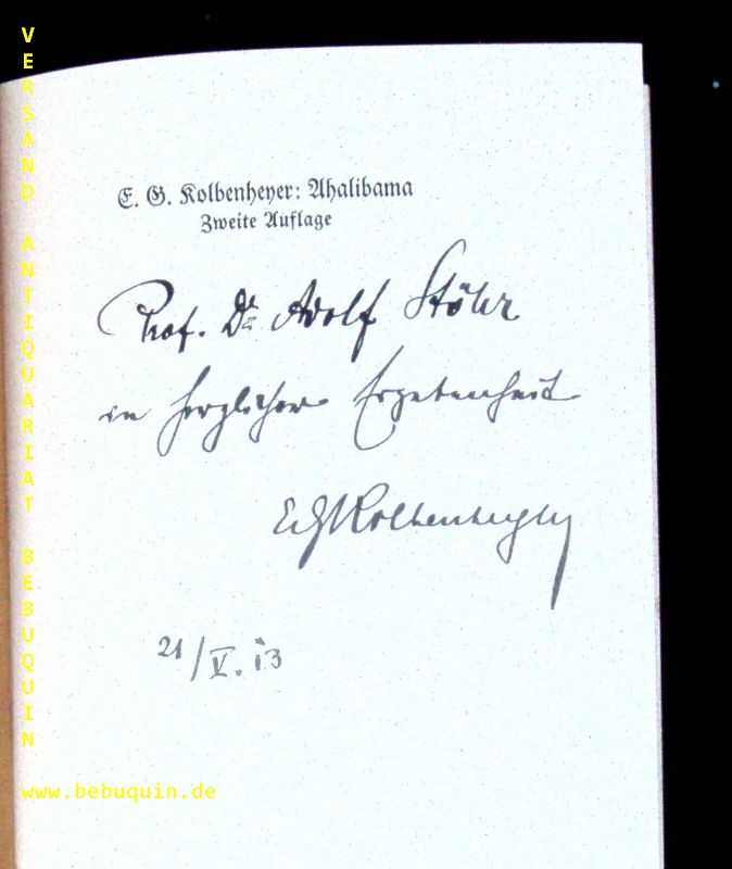 KOLBENHEYER, E.G.: Ahalibama. Drei Erzählungen. 2. Aufl. München (Georg Müller), 1913. 276 (4) S OHLn mit goldgeprägtem Rückenschild. EA WG² 6. Mit einer 4zeiligen eigenhändigen voll signierten und datierten Verfasserwidmung an Prof. Adolf Stöhr auf Vortitel: „Prof. Dr. Adolf Stöhr in herzlicher Ergebenheit. Adolf Stöhr (* 24. Februar 1855 in St. Pölten, Kaisertum Österreich; † 10. Februar 1921 in Wien), bei dem Kolbenheyer in Wien studiert hatte, war ein österreichischer Philosoph und Psychologe. (Wikipedia)