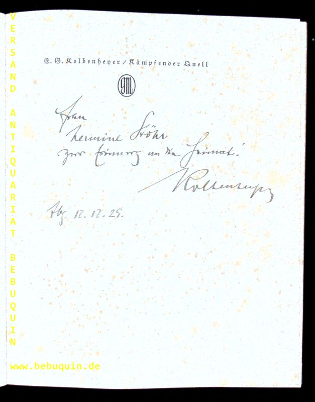 KOLBENHEYER, E.G.: Kämpferder Quell. (Karlsbad-Buch) München (Georg Müller), 1929. Gr. 8°. 140 (4) S. mit 8 Originalholzschnitten von Walther Klemm. OLn mit Goldprägung. innen teis stärker stockfleckig. EA WG² 23. Mit einer 4zeiligen eigenhändigen voll signierten und datierten Verfasserwidmung an Hermine Stöhr auf Vortitel.