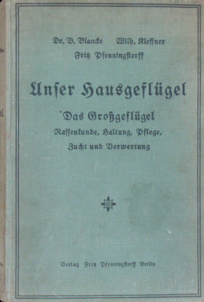 ORNITHOLOGIE.– BLANCKE, B. + KLEFFNER, Wilhelm: Das Großgeflügel. 1. Band: Rassenkunde + 2. Band: Haltung, Pflege, Zucht und Verwertung des Geflügels. 5. wesentlich vermehrte und verbesserte Aufl. 2 Bände in 1 Bd. Berlin (Pfennigstorff), 1925. Gr. 8°. VI, 624 S. mit 573 Textabb., einer großen Anzahl von Rassebildern + 100 farb. Bildtafeln; VIII, 624 S. mit 538 Textabb., zahlr. scharzen und 6 farb. Bildtafeln. OLn. Rücken etwas geblichen, vorderes Gelenk gelockert, sonst sehr feines Ex. Ein ausführliches Handbuch über Zucht, Haltung und Pflege unseres Hausgeflügels. Hier in der raren gesuchten stark erweiterten Ausgabe.