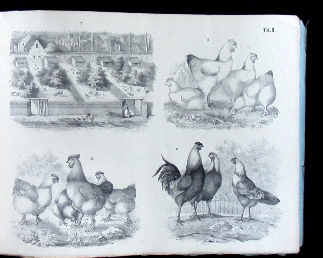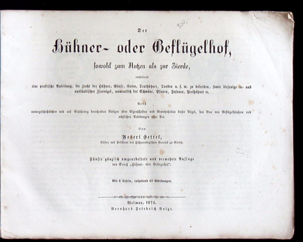 ORNITHOLOGIE.– OETTEL, Robert: Der Hühner- oder Geflügelhof, sowohl zum Nutzen als zur Zierde. Enthaltend eine praktische Anleitung die Zucht der Hühner, Gänse, Enten, Truthühner, Tauben usw zu betreiben, sowie diejenigen in- und auländischen Ziervögeln, namentlich der Pfauen, Fasane, Schwäne, Perlhühner etc. Nebst naturgeschichtlichen und auf Erfahrung bertuhenden Notizen (…) aller Art. 5. gänzlich umgearb. und vermehrte Aufl. Weimar (Voigt), 1874. Quer 4°. VI, 68 (2) S. + 8 lithographischen Tafeln mit 43 Abb. ill. OKart. Einband an den Ecken teils leicht lädiert oder Überklebt, innen nur vereinzelt stockfleckig