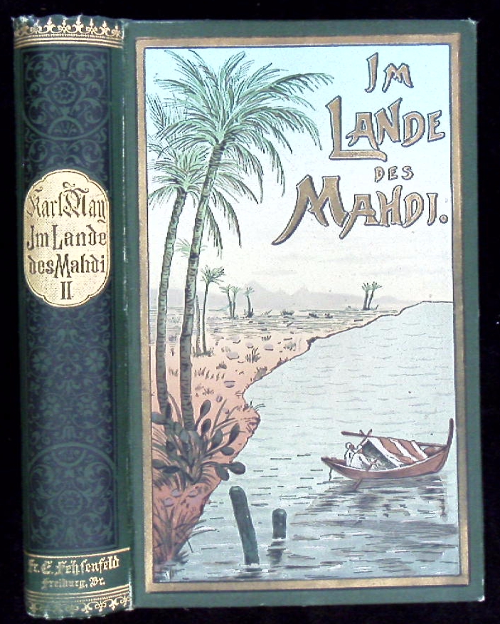 MAY, Karl: Im Lande des Mahdi. II. Band. Reiseerlebnisse. 21.– 25. Tsd. Freiburg (Fehsenfeld), (1901). 587 (1) S. farb. ill. OLn. (DB 68). NaV, Bandtitel auf Reihentitelblatt eingetragen, sonst tadellos mit strahlendem Rückengold. = Gesammelte Reiseerlebnisse, Bd. XVII. Plaul 279.5.
