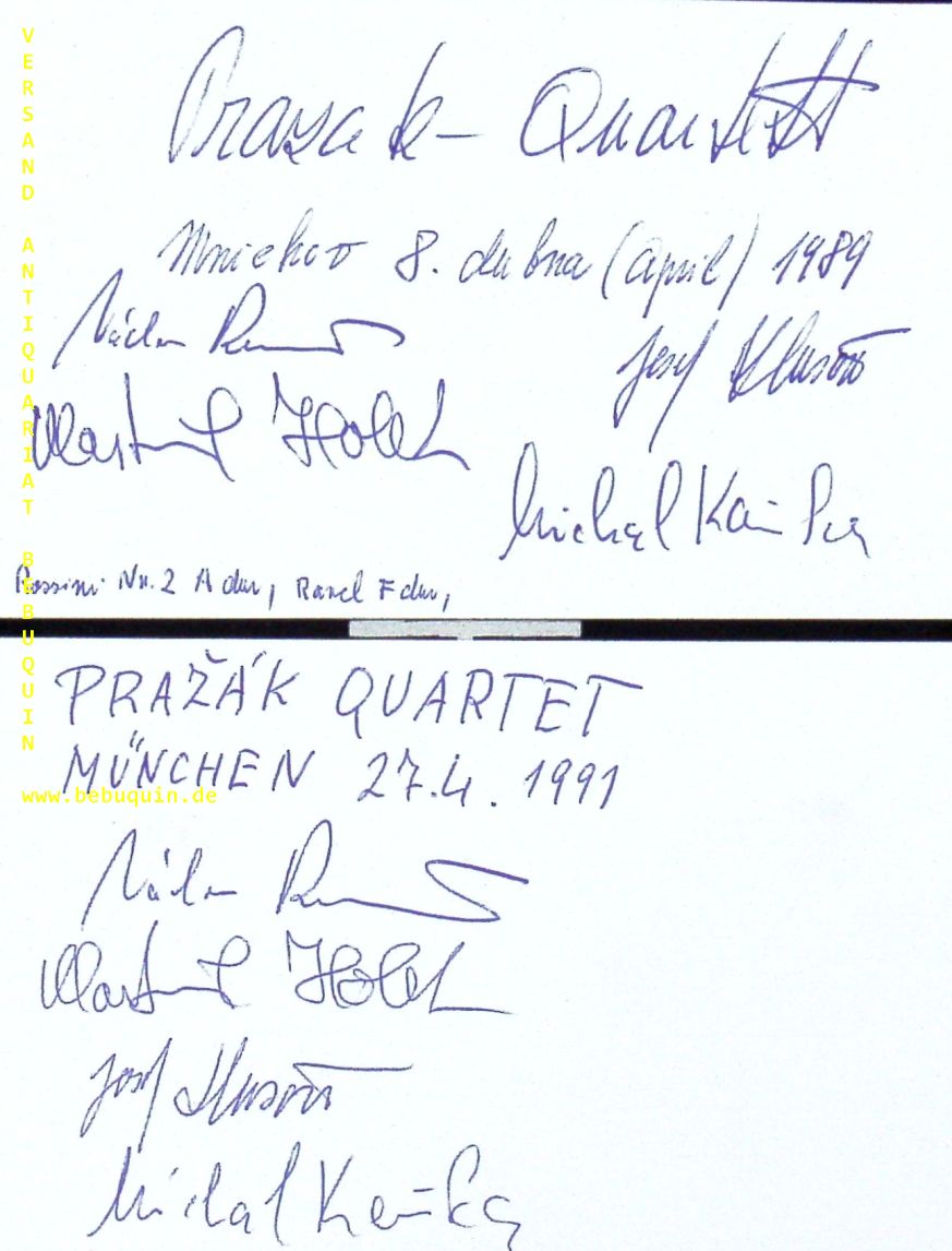 PRAZAK QUARTETT.– REMES, Vaclav + HOLEK, Vlastimil + KLUSON, Josef + KANKA, Michal: 2 eigenhändig von allen signierte und datierte Autogrammkarten. München (Herkulessaal), 1989 + 1991. 8 x 12,5 cm. Karteikarten. Das Pražák Quartett, heute eines der führenden internationalen Kammermusikensembles, wurde 1972 von Studenten des Prager Konservatoriums, in dem beinahe 30 Jahre vorher das Smetana Quartett entstanden war, gegründet.