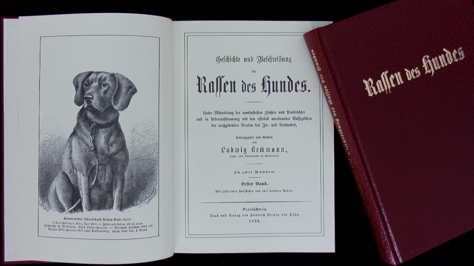 HUNDE.– BECKMANN, Ludwig: Geschichte und Beschreibung der Rassen des Hundes. Unter Mitwirkung der namhaftesten Züchter und Preisrichter und in Übereistimmung mit des offiziell anerkannten Rassenzeichen … Reprint, 1894/1895, Braunschweig, Vieweg. 2 Bände. Reprint der Ausgabe Braunschweig 1894. Mürlenbach/Eifel, (Fleig), 1983. XIV, 386, (2), XII, 351 S. mit zahlr. Textabb. und zwei farb. Bildtafeln. OKunstlderbände mit Goldprägung. tadellos.