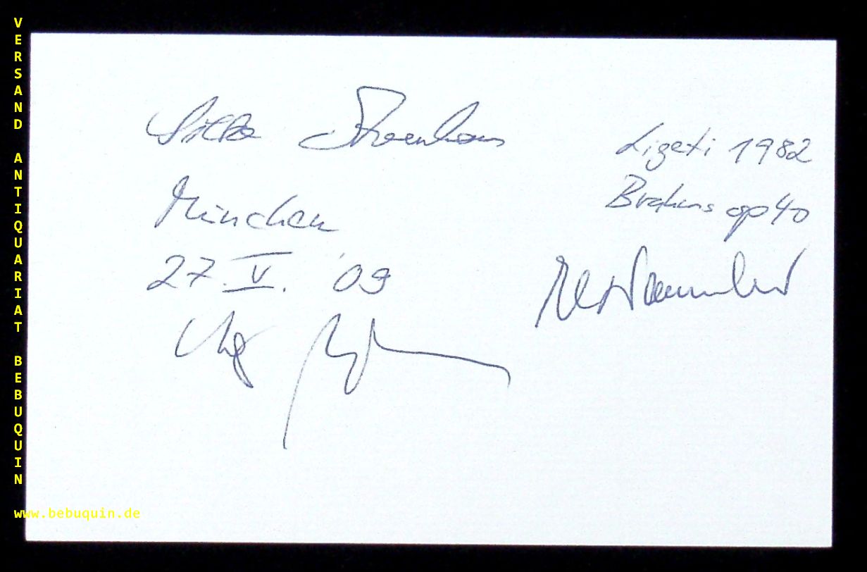 NEUNECKER, Marie Luise (Hornistin) + WEITHAAS, Antje (Violinist) + ARENHAUS, Silke (Pianist): eigenhändig von allen signierte und datierte Autogrammseite. München (Herkulessaal), 27.5.2009.. 8 x 12,5 cm. Karteikarte.