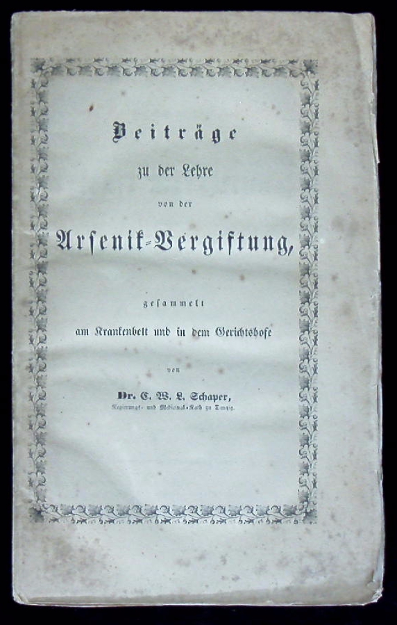 MEDIZIN.– SCHAPER, Carl Wilhelm Ludwig: Beiträge zu der Lehre von der Arsenik-Vergiftung. Gesammelt am Krankenbett und in dem Gerichtshofe. Berlin (Reimer), 1846. VI, 274 S. ill. OBr. unbeschnitten. EA. Carl Wilh. Ludw. Schaper (1801-78) promovierte in Berlin, wurde Kreisphysikus in Elbing, Regierungs-und Medizinalrat in Danzig und Aachen.