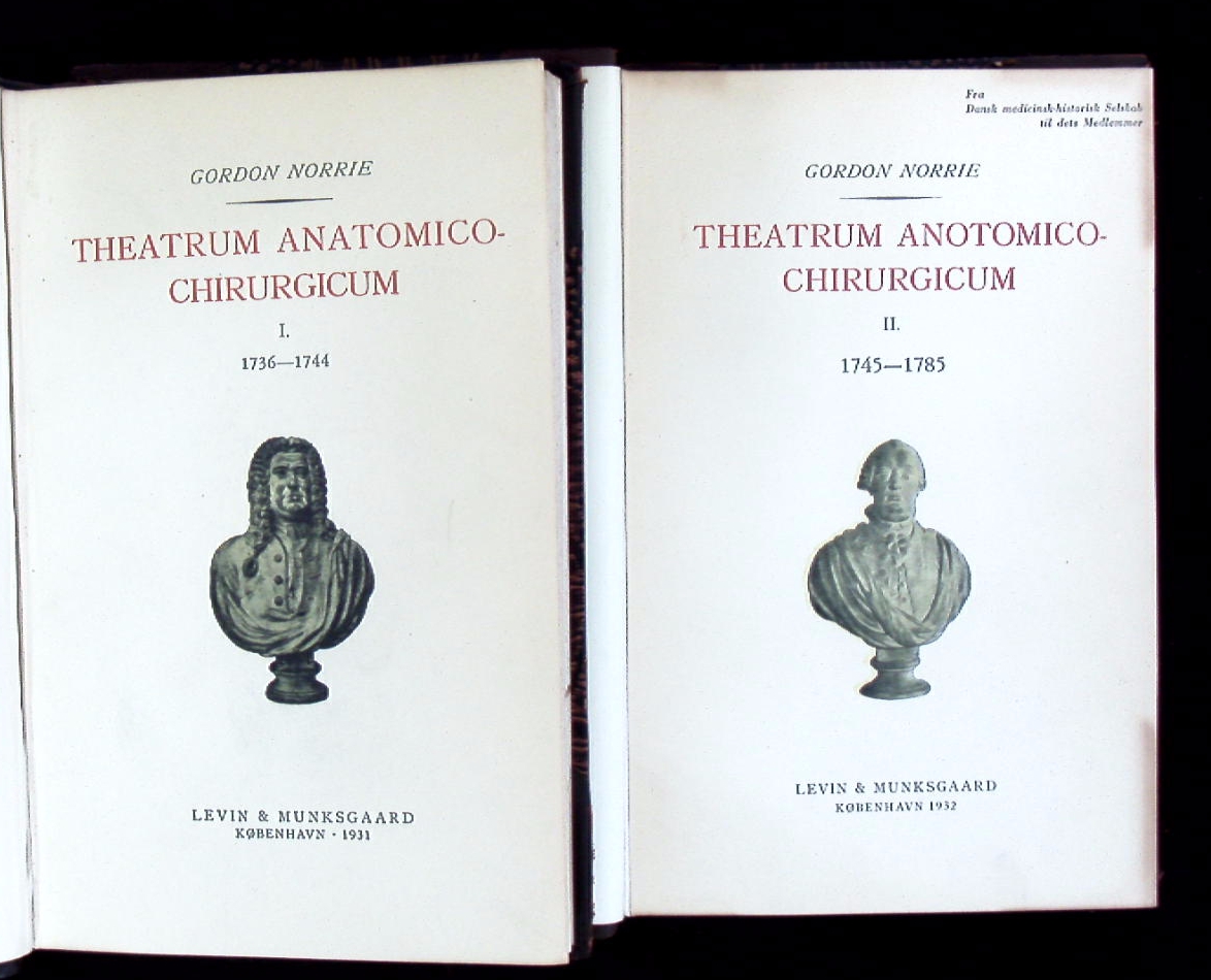 MEDIZIN.– NORRIE, Gordon: Theatrum anatomico-chirurgicum. I. + II. Teil: 1736-1785. 2 Bände. København (Levin & Munksgaard), 1932. 182, 174 S. + zahlr. Bildtafeln. OHLdr mit goldgeprägtem Rücken. Rücken kaum berieben, gutes Ex. EA.
