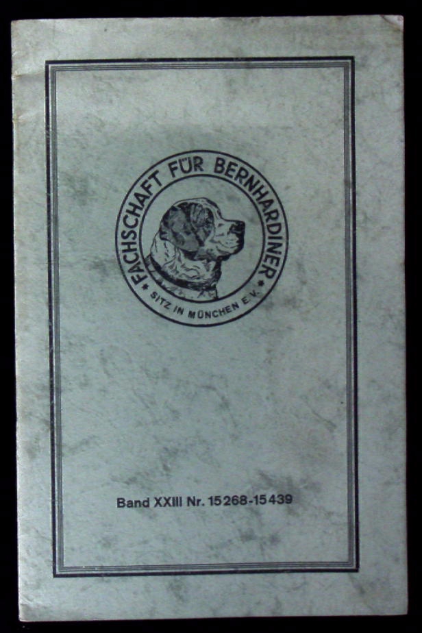 HUNDE.– GLOCKNER, Hans: Reichs-Zuchtbuch Abteilung Bernhardiner (BZB). Bd. XXIII. Nr. 15268 – 15439. Geführt von der Fachschaft für Bernhartdiner. Zuchtbuchstelle. München (Schon), 1940. Gr. 8°. 32 (1) S. mit zahlr. Bildern. ill. OKart. gering bestaubt, gutes Ex. seltene EA.