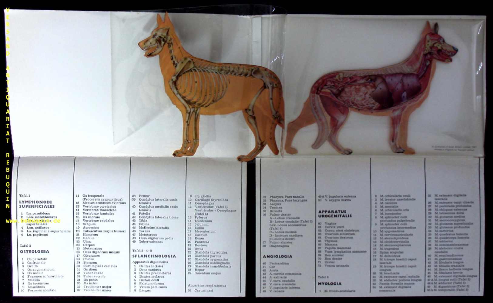 HUNDE.– LEDERLE: Anatomische Tafeln. 2: Hund. München (Lederle), 1968. Quer Gr. 8°. 4 Bl. mit 3 beidseitig bedruckten Folien ill. OKart. seltene EA.