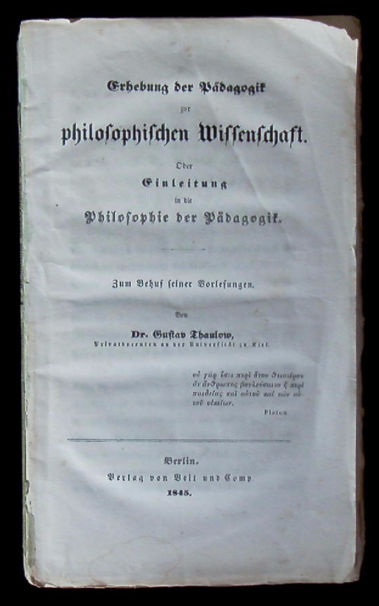 THAULOW, Gustav Ferdinand: Erhebung der Pädagogik zur philosophischen Wissenschaft. Oder Einleitung in die Philosophie der Pädagogik. Berlin (Veit), 1845. Gr. 8°. XIV, 212 S. ohne Einband. unbeschnitten. wichtige seltene EA des deutschen Erstlings. Gustav Ferdinand Thaulow (* 6. Juli 1817 in Schleswig; † 11. März 1883 in Kiel) war ein deutscher Professor der Philosophie, Kunstsammler und Begründer des Kieler Thaulow-Museums. (Wikipedia)